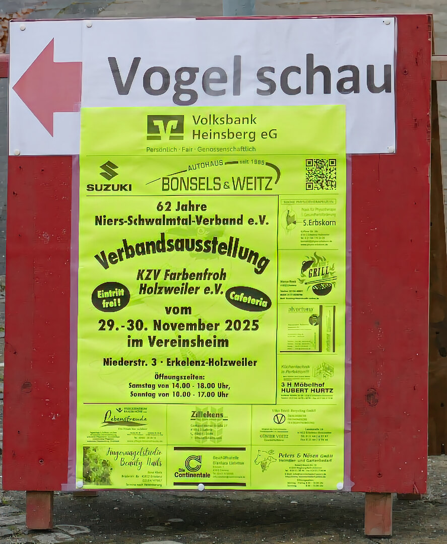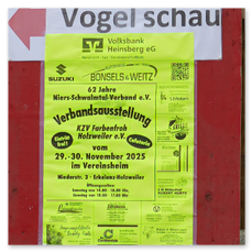 Am 29. und 30. November 2025 war die 62. Verbandsausstellung des Niers-Schwalmtal-Verbandes e.V in Holzweiler. Die Ausstellung wurde ausgerichtet vom Kanarienzuchtverein Farbenfroh e.V. Holzweiler.
